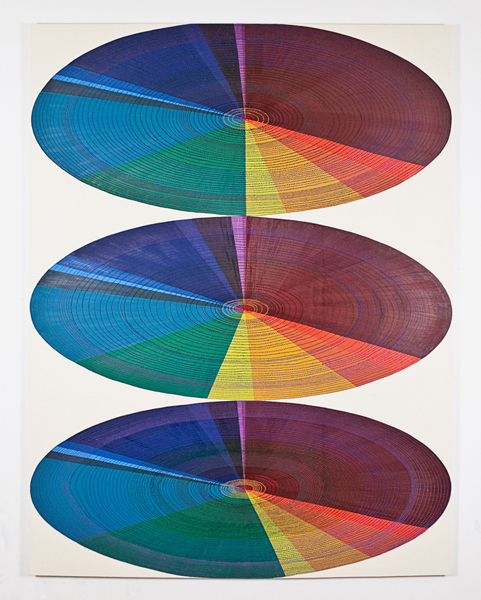 The rings of dots are measuring in a coded language the earnings of men and women in relationship to their level of education taken in 2005 (the male statistics are over lapping the male disc, the female statistics are over lapping the female disc, and the average between the two is over lapping the top disc).  The colors chosen are based on the color Luscher test that I took before the dotting ritual.  Starting from the edge and moving towards the center: doctorate is violet; professional is blue; master’s is green; bachelor’s is gray; associate’s is brown; some college, no degree is black; high school graduate only is yellow and no high school diploma is red.  Rounded to the thousandth, these numbers are written at the bottom of each disc